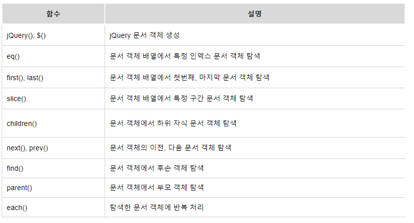 - 제이쿼리는 HTML 문서 객체(DOM) 를 제어하기 위해 라이브러리 함수 제공